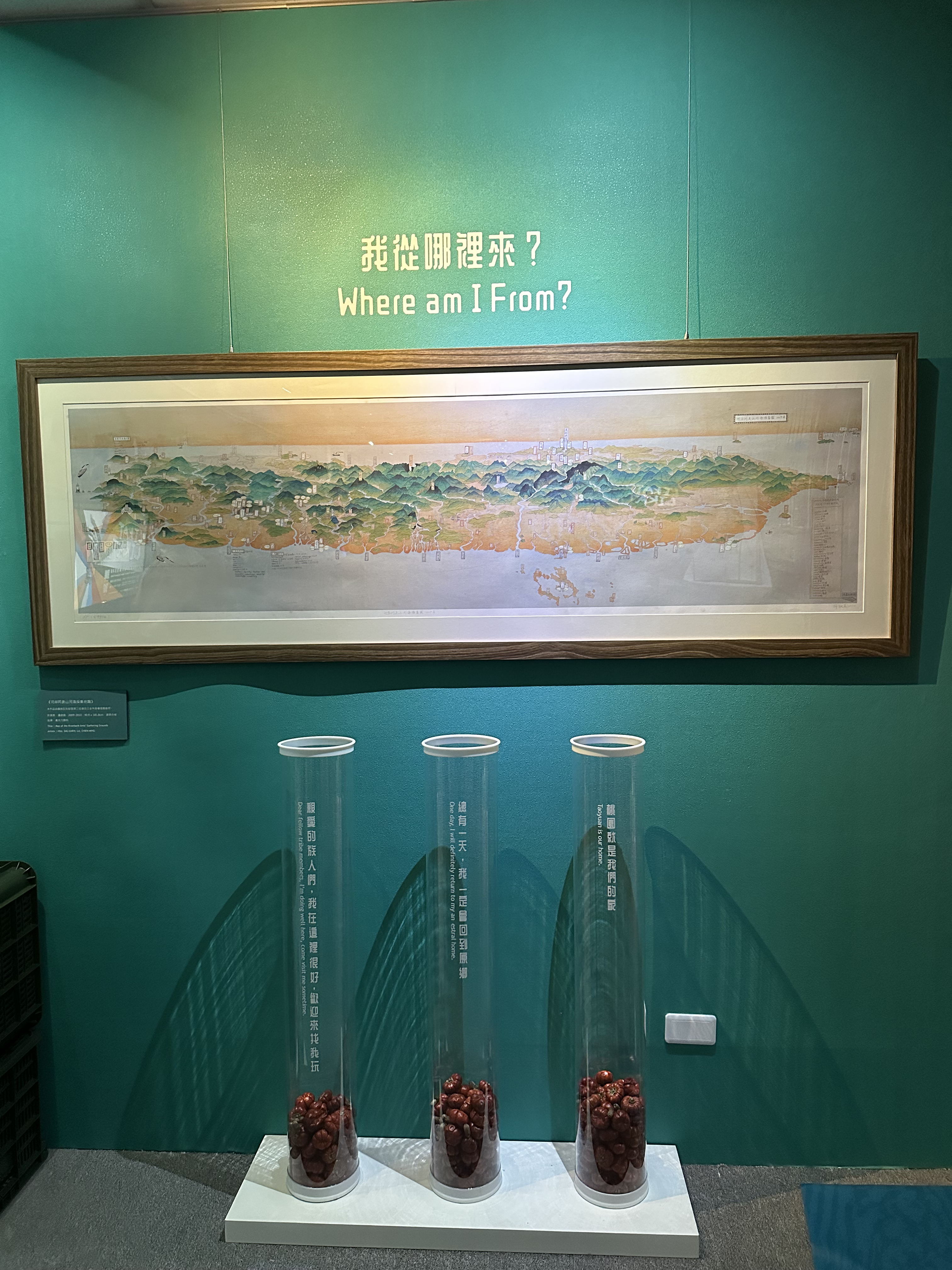 另一個有趣的介面是「原民膠囊」,一個以味覺為媒介的參與式設計。展覽邀請觀者 親手取下一顆顏色各異的膠囊,在理解和經驗之間,味道與問題同時浮現。「靈魂拷問」掛在一個大哉問「我從哪裡來」之下,並置著一幅地圖。問著你從哪裡來,你是否留在這裡,以及最終如何看待自己。這些問題並非要得到答案,而是引導觀者以身 體的方式新思考身分。