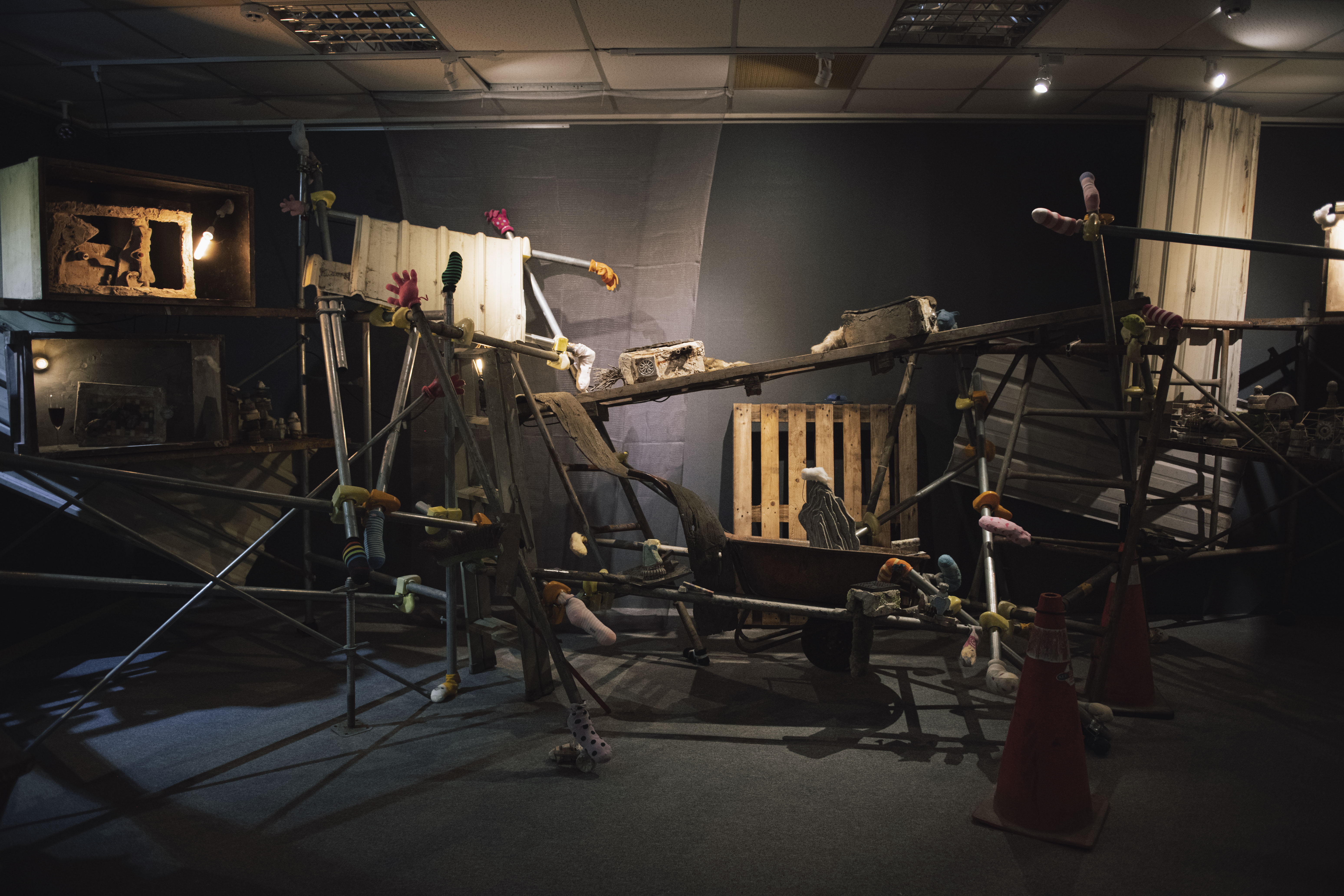 但這樣的展場語言,也暴露出符號的限制。滿布的工地物件雖然強烈,卻可能讓人瞬間被拋入一個「被想像的原民都市」框架之中。那些疲倦、幽默、無奈、與柔軟的日 常情感,往往被硬質的符號掩蓋。紗網的存在特別引人注目,那種半透明、低功能的材質,彷彿提醒我們,原住民族的都市經驗,並非單線、樂觀或完成式的故事,而是一種暫時、甚至可能是破碎的存在。
