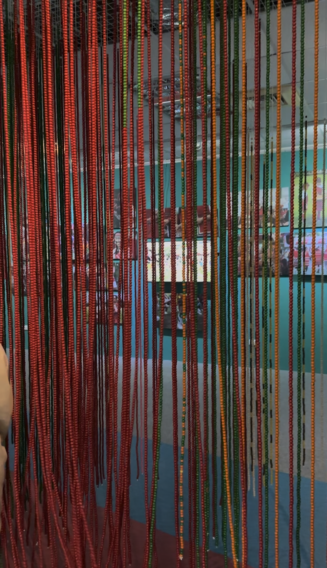 穿越進第二個展廳,氣氛明顯轉變。微光籠罩整個空間,光線不再刺眼,反而是柔軟地浮動在珠簾與影像之間。珠簾、羊毛氈、味覺裝置取代了工地的沉。門口珠簾那八萬八千顆珠子,象徵八萬八千位原住民族,構成一種「集體相遇」的視覺經驗。桃園十六族皆在其中,提醒我們城市早已成為新的族群聚落。祭儀不再只在山林部落舉行,也在都市公園與社區間延續,文化在流動中找到新的節奏。
