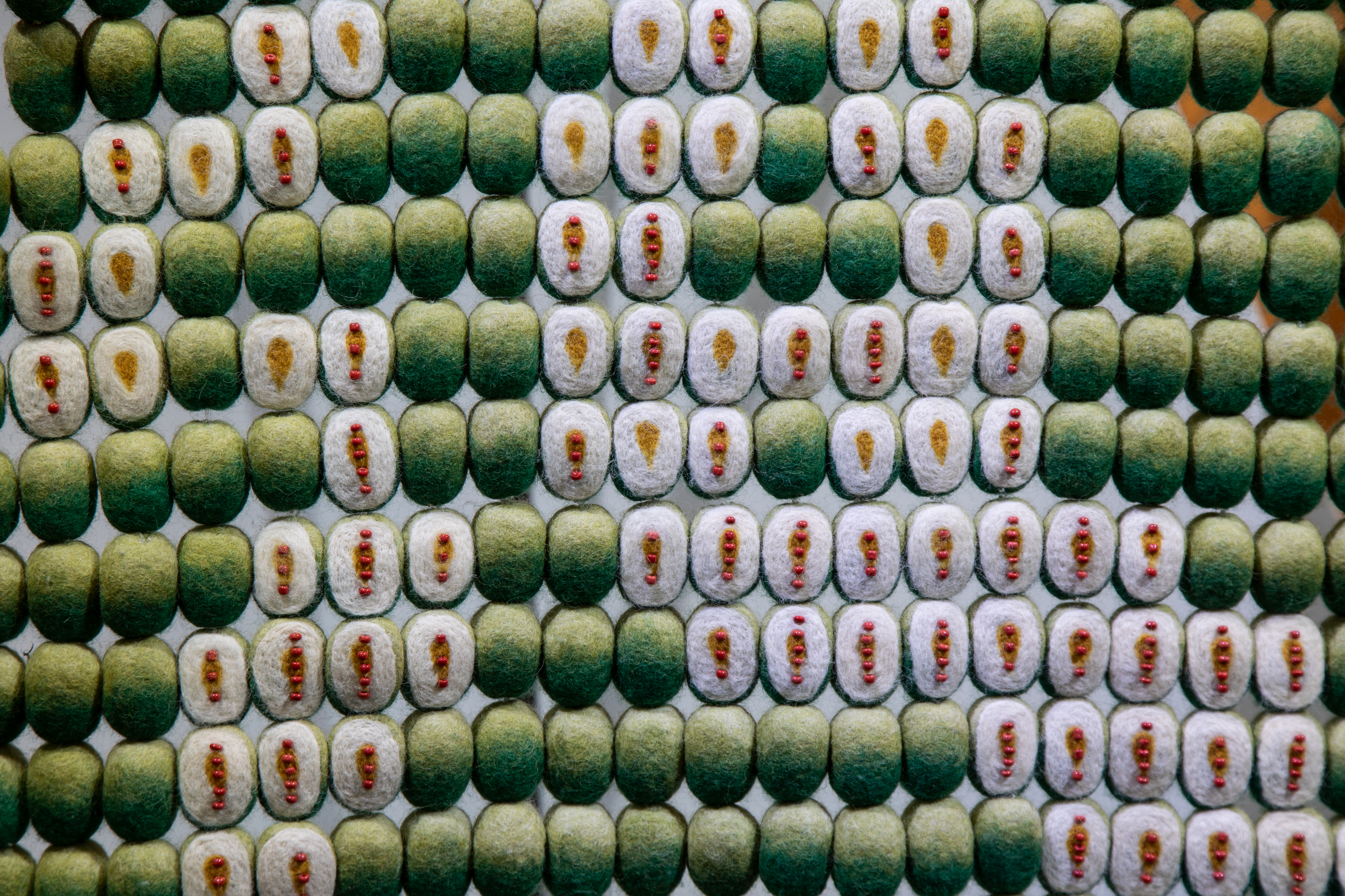 羊毛氈作品回應外來宗教與原住民族信仰之間的張力。那並非單純的衝突,而是一種連結,一場關於信仰與身體的再協商。創作者在這裡多屬第二代城市原民,他們不再執著於被觀看的「原民性」,而以跨文化的語彙自由轉譯自己的經驗,走向「再現者」的主體位置。在這個展廳裡,影像紀錄成為關鍵的語言。整個空間以微光映照著 受訪者的臉龐,那些畫面來自展覽團隊長期的田調查與訪談。