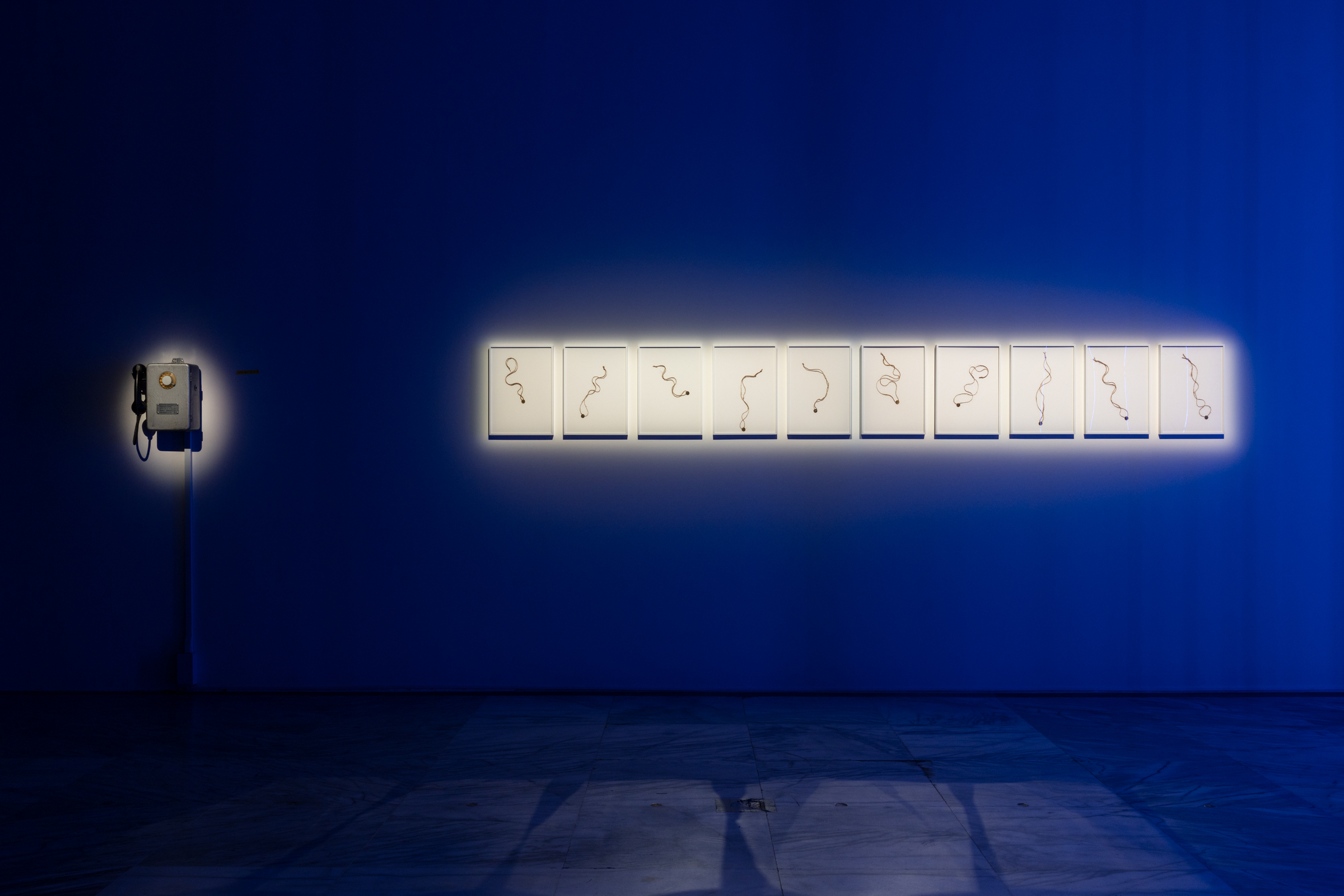 安娜・葉爾莫萊娃,《在線上》,2025,蘇聯時期公共電話,每座 37 × 28.5 × 13 公分,含框繫線硬幣,每組 42 × 29.7 公分,藝術家版權所有,由2025 台北雙年展委託製作,協力單位:Federal Ministry for Housing, Arts, Culture, Media and Sport of the Republic of Austria,奧地利台北辦事處。圖像由臺北市立美術館提供,攝影呂國瑋。