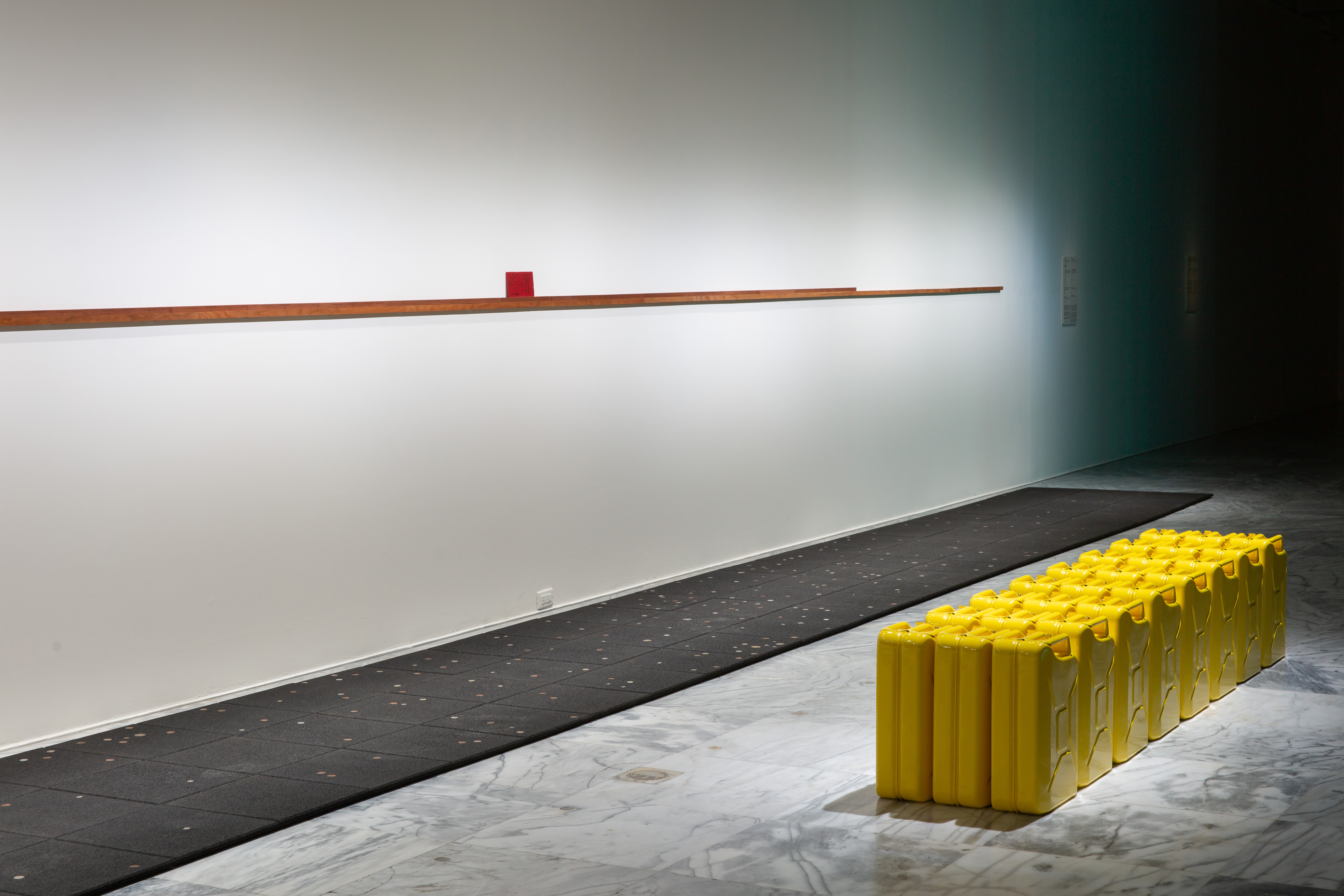 如同《在線上》,居住在柏林的越裔德籍藝術家蕭崇(Sung Tieu)的裝置作品《治理》(The Ruling (The Banque de l'Indochine's Profits, 1875-1939), 2025),匯集了看似毫無關聯的物件⸺如尺一般帶有刻度的長形木製牆面、23個汽油罐(裝滿著汽油,其中一桶裝著藥物),以及鑲嵌著法屬印度支那硬幣的方形橡膠墊——展現了法國殖民系統對於「印度支那」地區(今日的越南、寮國和柬埔寨)之治理模式。這些看似中性的物件,顯示了另一種「仁慈」(benevolent)的帝國統治模式,以標準化的測量單位,取代殖民前流通的單位「尺」(xích),成為土地稅賦與勞動剝削的工具,建構法國文明化的想像。這項作品暴露出制度看似去政治化實則深具權力後設的面貌:量尺與硬幣,不僅是曾用於衡量土地的物件,更是要觀者去追問何為「可見」、何為「可量」,以及這些看似理性系統如何界定殖民的關係與人們的存在位置。《治理》中的汽油罐,其一裝滿了藥物,蕭崇表示,這代表了在殖民政權之下人們仍是不斷找尋對抗跟逃逸的可能。