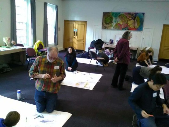 工作坊下半場則分組進行身體地圖(body mapping)的創作,每一組挑選一人躺在比人體還大的繪圖紙上,其他組員幫忙勾勒出身體輪廓來。藝術家要求說,這個躺在地上的人是有情緒的,身體語言是活潑的,可以擺放各種姿勢。接下來,我們把器官拼貼到這個身體地圖之中,然後用色筆為身體進行塗鴉。在身體地圖創作之後,每一組就開始進行特定的情境演練。這些情境假設每一組所畫的人有某種特定的疾病,因而必須向其他組人協商器官移植的可能。每組之間必須進行遊說,說明器官移植的理由,跟可能預期的結果。