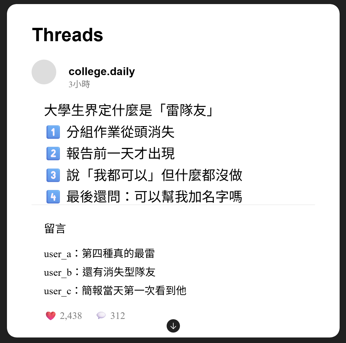 Dcard(或者黑特)是台灣大學生最重要的「抵抗空間」之一。作為核心機制的「校區匿名」發文設計,完美對應了Scott所說的「匿名誹謗」策略。在現實中,學生與學校的權力關係不對等。但在Dcard上,學生戴上匿名面具,發動「數位奇襲」。這種匿名性打破了身分階層。當大一新生能透過一篇爆料文讓某個講性騷笑話的教授被校方調查時,這就是典型的「弱者的武器」。然而,這種抵抗也帶有模糊地帶。Dcard常演變成「公審」。從人類學角度看,這是一種社會控制(social control)的展現。就像傳統村落透過八卦來羞辱不遵守規範的人,大學生也透過Dcard來界定什麼是「雷隊友」、什麼是「渣男」。這種集體的制裁,補足了官方法律或校規無法觸及的情感道德領域。而如果說 Dcard 是在進行「抗爭與制裁」,那麼 Threads(脆)則更傾向於「情感主體性」(Affective Subjectivity)的建構。Threads的運作邏輯不是長篇大論,而是碎片化的感官體驗。當一個學生寫下:「快要期末考了,我卻在圖書館看著地板哭了一小時。」這種看似無意義的「廢文」,其實是一種情感勞動(affective labor)。這與傳統的「強者抵抗」不同。這是一種「展現脆弱」的抵抗(vulnerability as resistance)。在要求卓越、要求競爭力的當代大學校園,承認自己的無能、焦慮與崩潰,本身就是對主流成功敘事的一種拒絕。當網路上的陌生人在Threads上點讚這份脆弱時,一個「情感共同體」就誕生了。他們不再是孤立的、被結構壓迫的主體,而是透過彼此的 gossip 與情感共鳴,重新找回了「我在」的感覺。